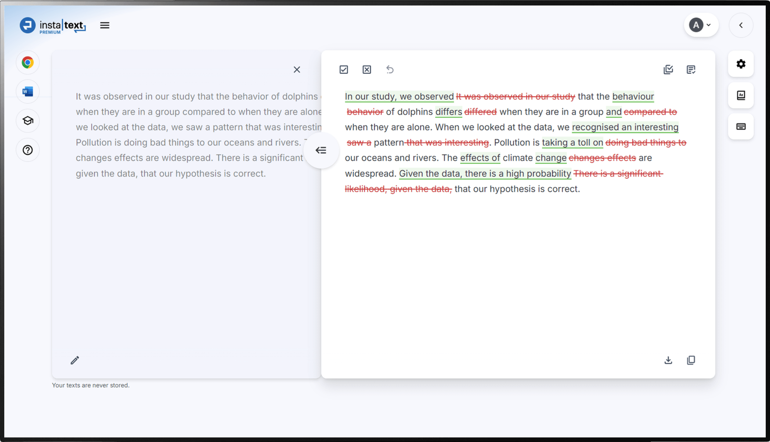 For this reason, InstaText falls within the category of “editing assistance” and complies with the authorship and originality criteria of academic publications. Authors can therefore use it with confidence, knowing that it supports them in maintaining academic integrity.