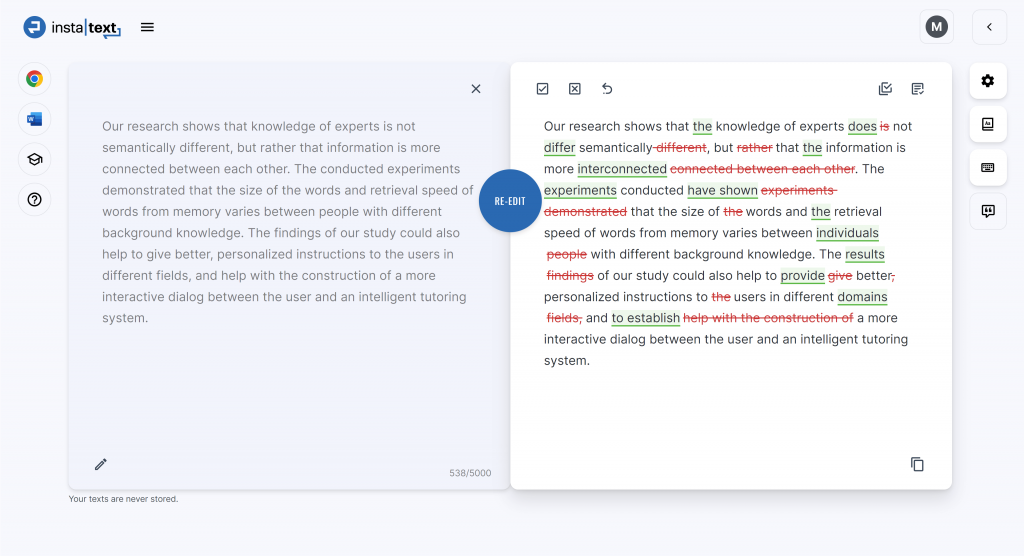 If you ever need to modify your original text – perhaps to add some extra details or make a few changes before resubmitting – you can easily switch your focus between the left and right canvases. While you edit the original text on the left, the improved version remains visible on the right, unaffected and ready for reference.