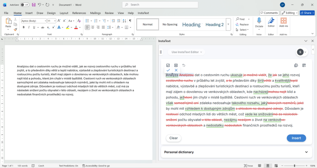 Now, you can use InstaText to polish all your Czech writing – from everyday messages and emails to blog posts, social media content, essays, research papers, reports, and professional documents.