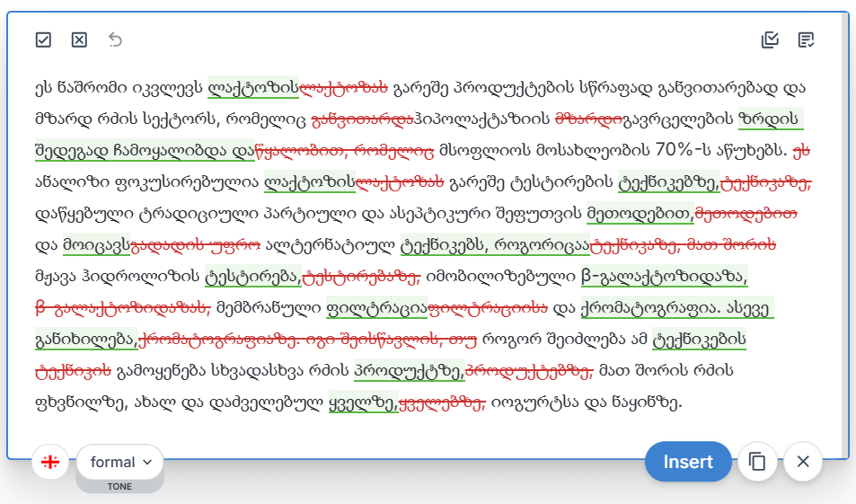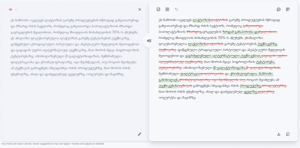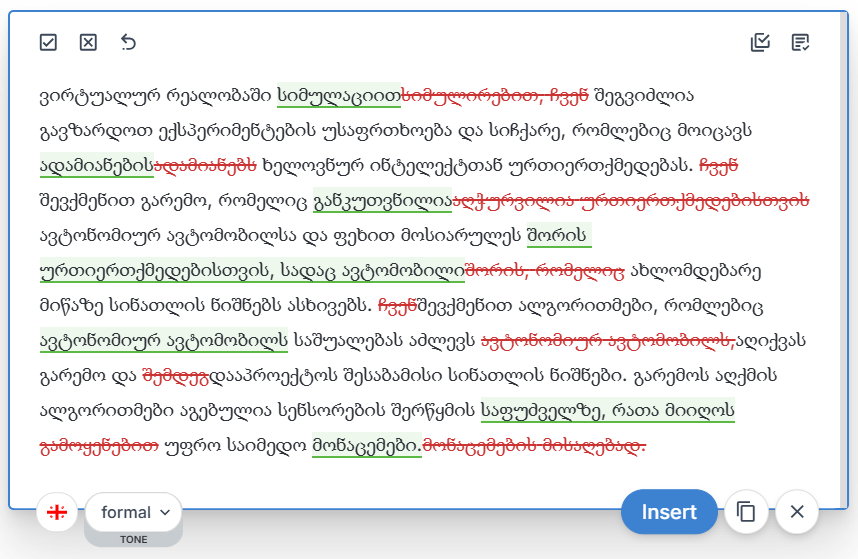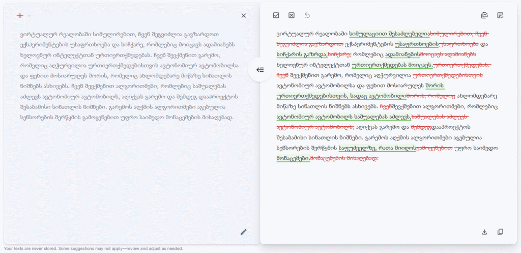 Our English editing remains our flagship, most advanced and professional-grade service, refined through years of data training. Meanwhile, we’re continuously improving our Georgian language support to provide even better editing suggestions over time.