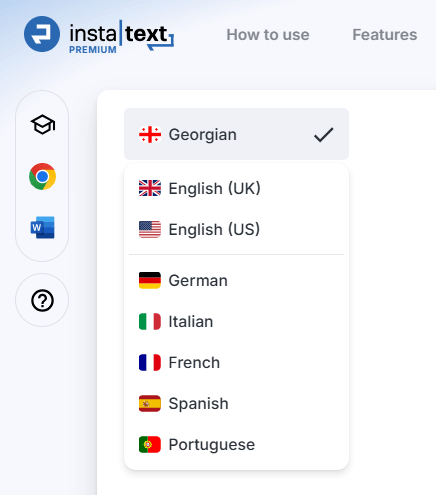 Ready to experience InstaText’s Georgian support? Sign up or log in at instatext.io and select Georgian in the Editor to see how InstaText can elevate your writing.
