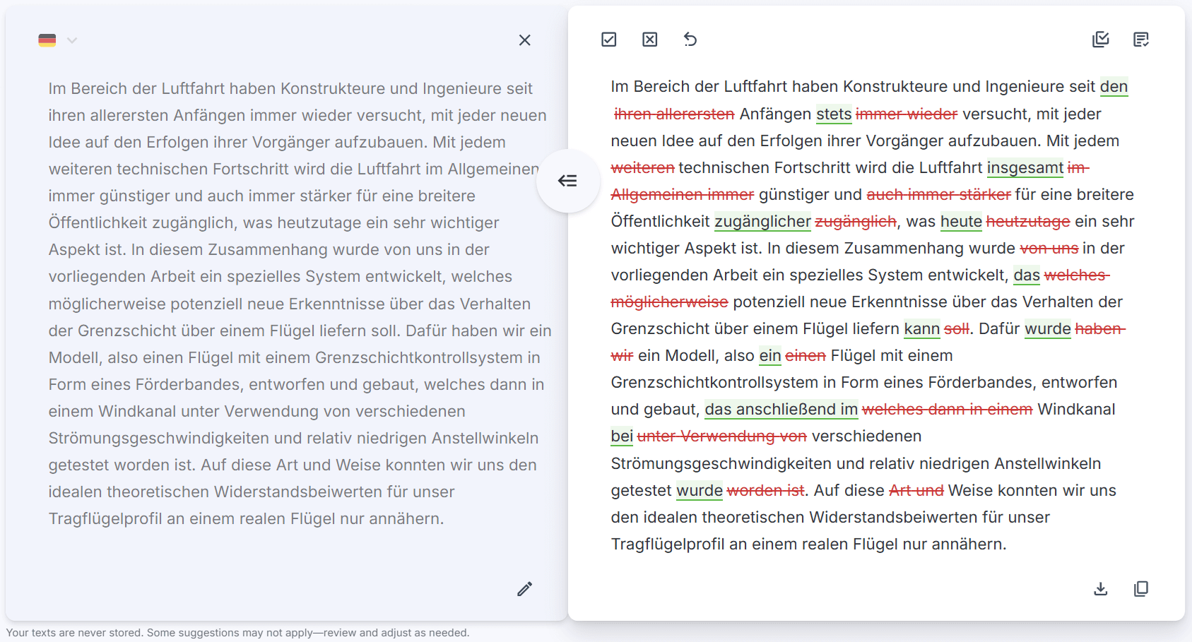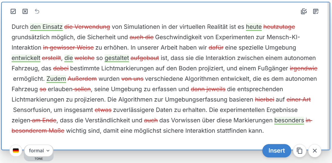 Our English editing remains our flagship, most advanced and professional-grade service, refined through years of data training. Meanwhile, we’re continuously improving our German language support to provide even better editing suggestions over time.