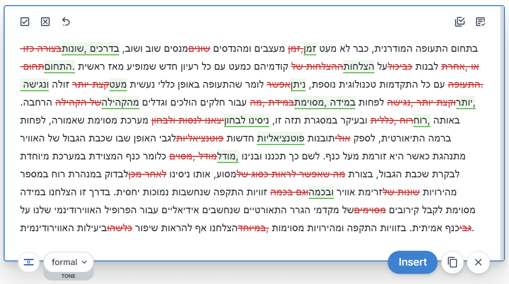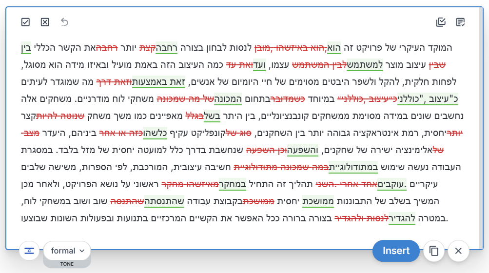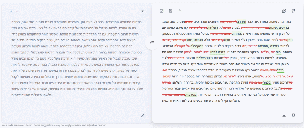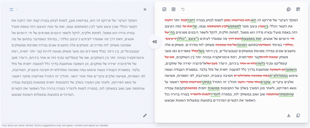 Our English editing remains our flagship, most advanced and professional-grade service, refined through years of data training. Meanwhile, we’re continuously improving our Hebrew language support to provide even better editing suggestions over time.