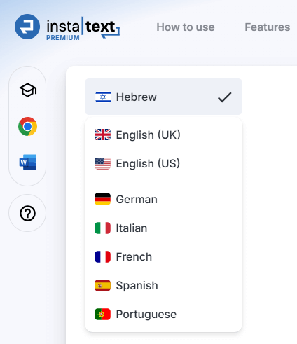 Ready to experience InstaText’s Hebrew support? Sign up or log in at instatext.io and select Hebrew in the Editor to see how InstaText can elevate your writing.