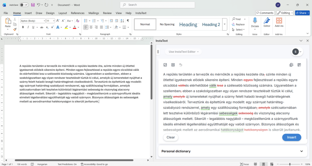 A: You can improve all types of writing in Hungarian – from academic papers and professional emails to reports, essays, and everyday messages. InstaText enhances clarity, readability, accuracy, and overall impact while preserving your unique voice, intent, authorship, and originality.
