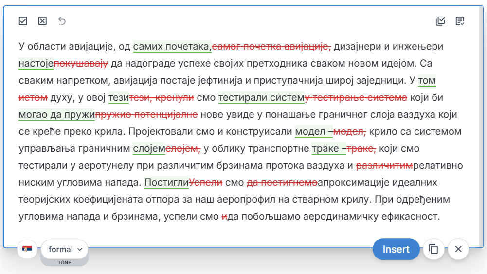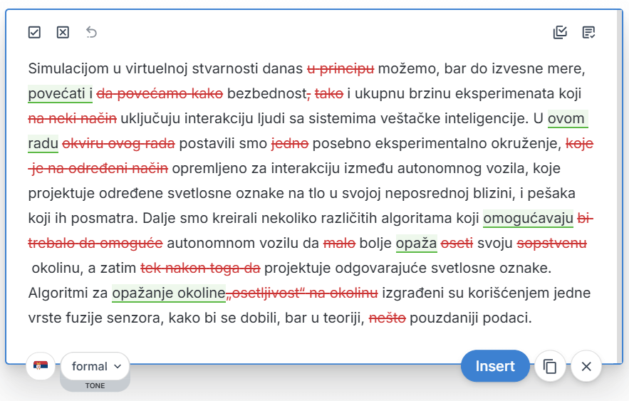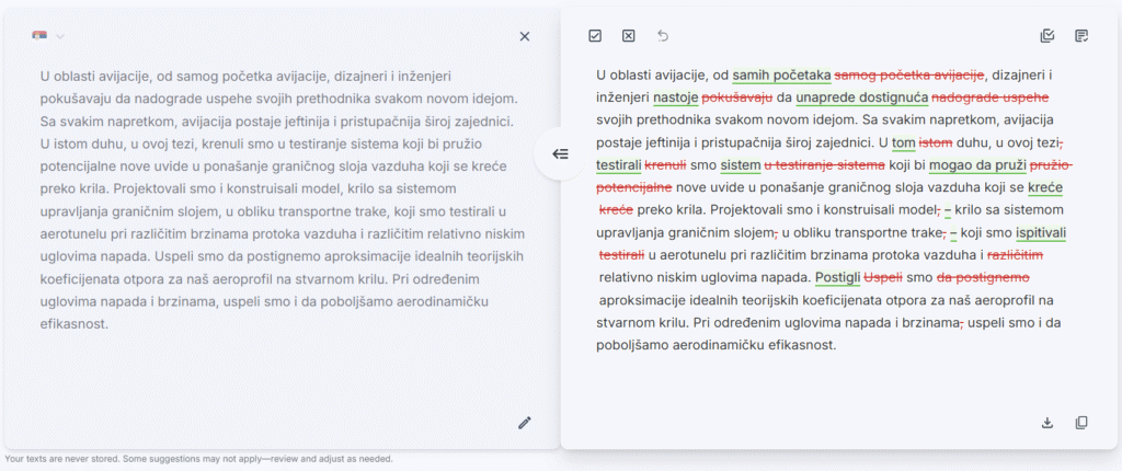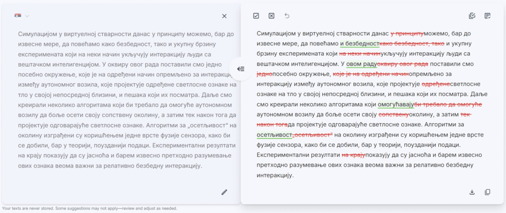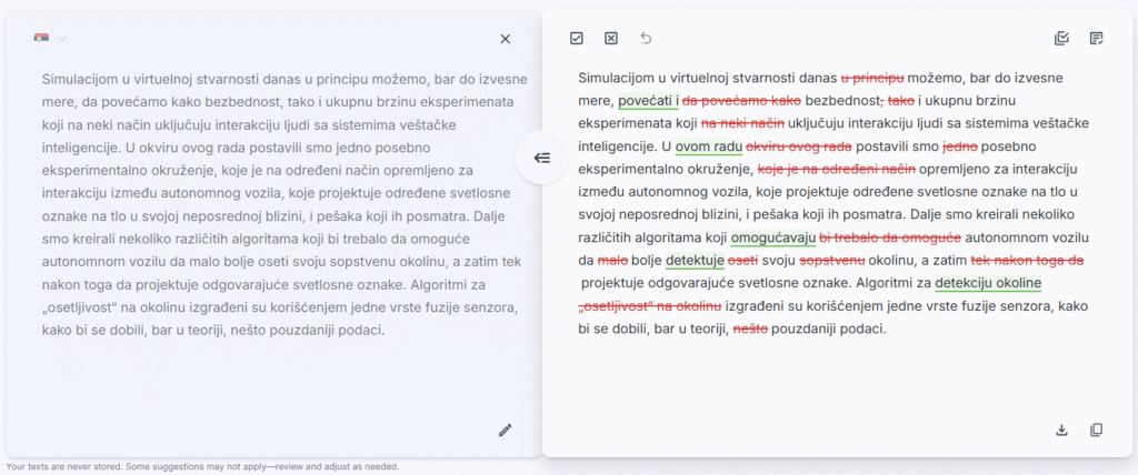 Our English editing remains our flagship, most advanced and professional-grade service, refined through years of data training. Meanwhile, we’re continuously improving our Serbian language support to provide even better editing suggestions over time.