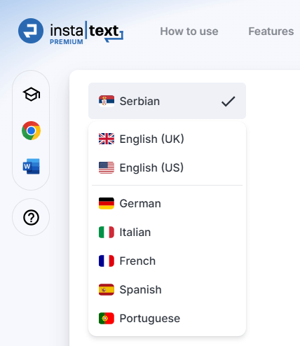 Ready to experience InstaText’s Serbian support? Sign up or log in at instatext.io and select Serbian in the Editor to see how InstaText can elevate your writing.