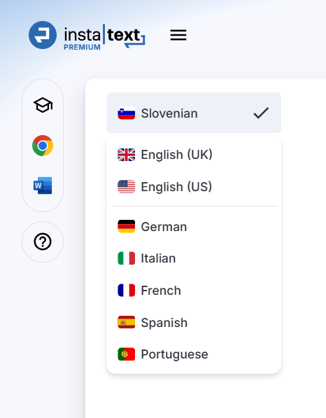 Ready to experience InstaText’s Slovenian support? Sign up or log in at instatext.io and select Slovenian in the Editor to see how InstaText can elevate your writing.