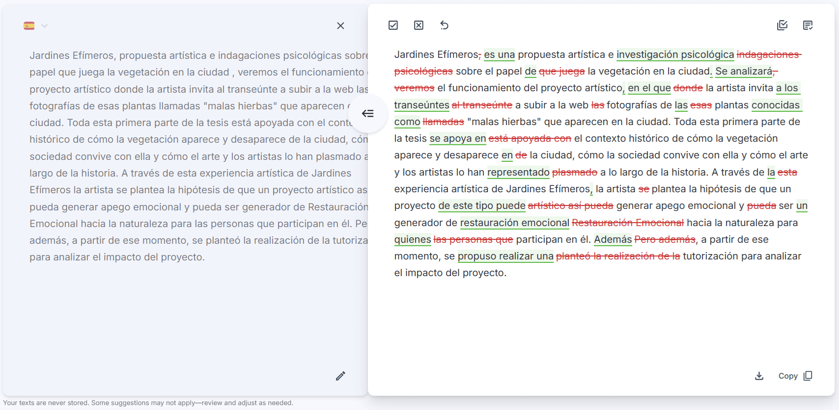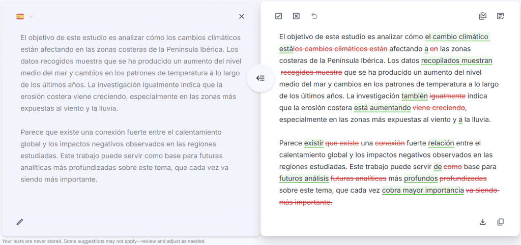 Our English editing remains our flagship, most advanced and professional-grade service, refined through years of data training. Meanwhile, we’re continuously improving our Spanish language support to provide even better editing suggestions over time.
