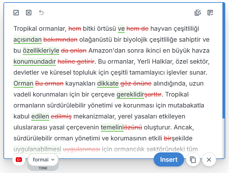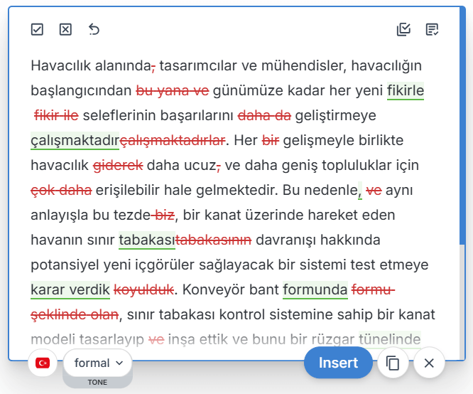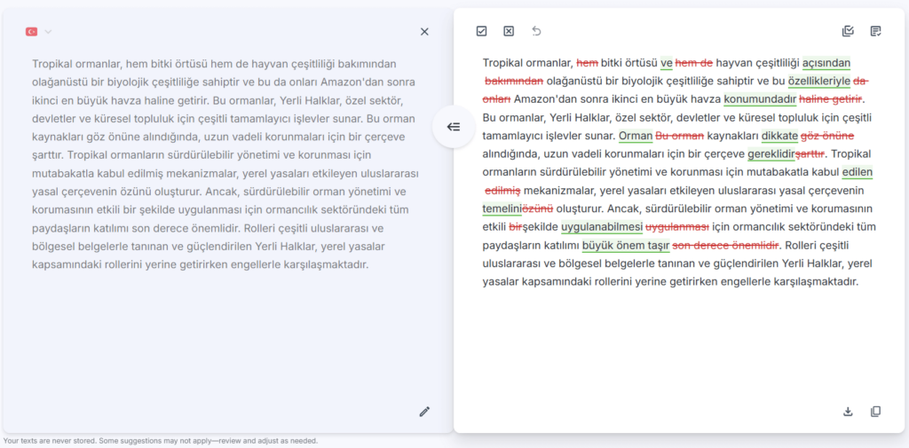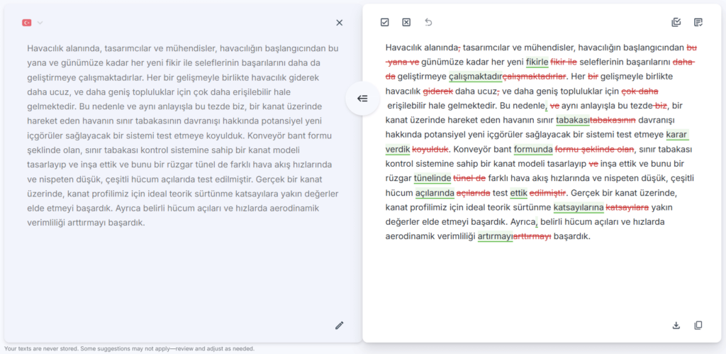Our English editing remains our flagship, most advanced and professional-grade service, refined through years of data training. Meanwhile, we’re continuously improving our Turkish language support to provide even better editing suggestions over time.
