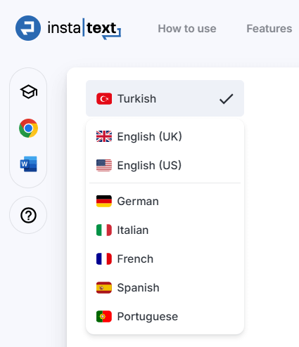 Ready to experience InstaText’s Turkish support? Sign up or log in at instatext.io and select Turkish in the Editor to see how InstaText can elevate your writing.