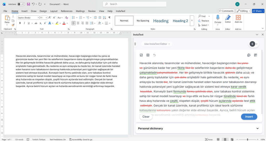 A: You can improve all types of writing in Turkish – from academic papers and professional emails to reports, essays, and everyday messages. InstaText enhances clarity, readability, accuracy, and overall impact while preserving your unique voice, intent, authorship, and originality.