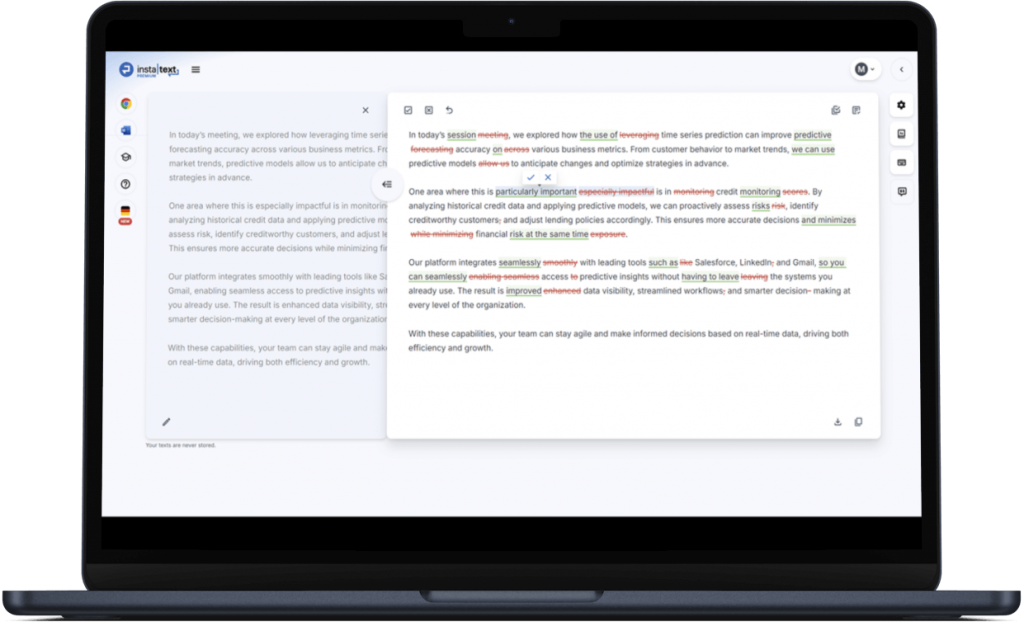 InstaText uses advanced language technologies for editing, but it is not a generative AI tool. It works on the text you write, rather than creating text from scratch. It improves clarity, structure, and wording without adding new ideas or changing the message. The goal is to help you express your own thoughts more clearly and professionally.