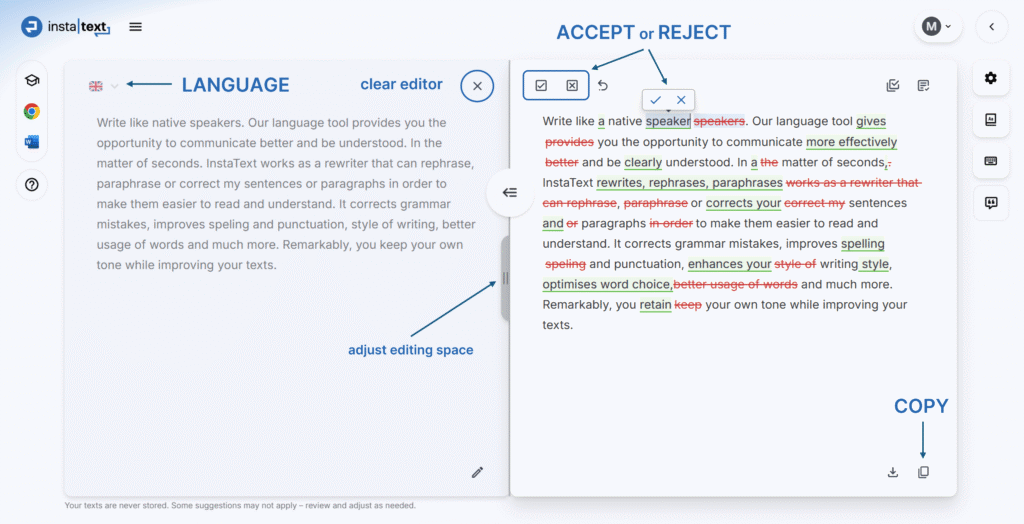 InstaText provides instant editing without prompts and integrates directly into over 20 commonly used platforms through its browser extension. It can also be used in Microsoft Word on both desktop and web, with Track Changes support. This allows users to edit where they already write – without switching tools or tabs, or copying text back and forth.